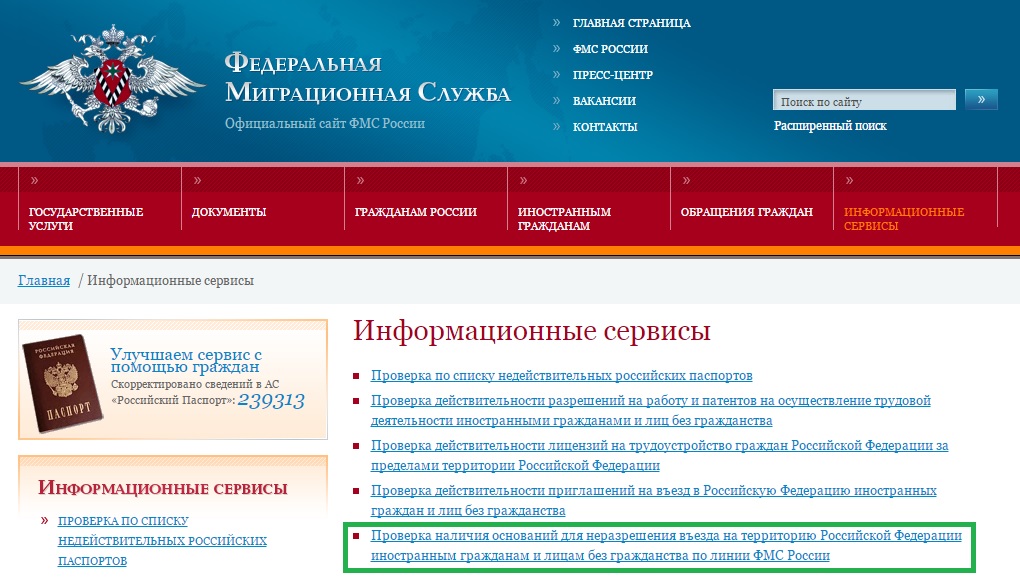 Заходим на сайт ФМС России и там находим раздел под названием «Информационный сервис». Открываем его. Далее необходимо перейти к пункту проверки наличия основания для запрета въезда в Россию по линии ФМС.