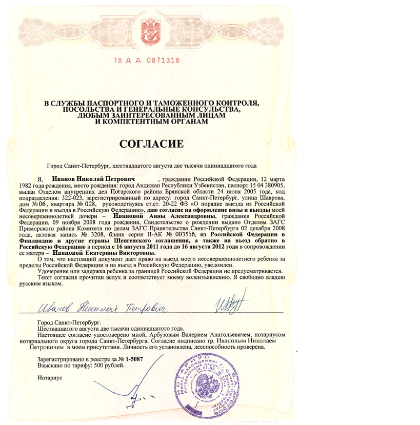 - Согласие (заверенное нотариально). В бумаге нужно указывать длительность путешествия и государство (одно или несколько), которые он может отведать.